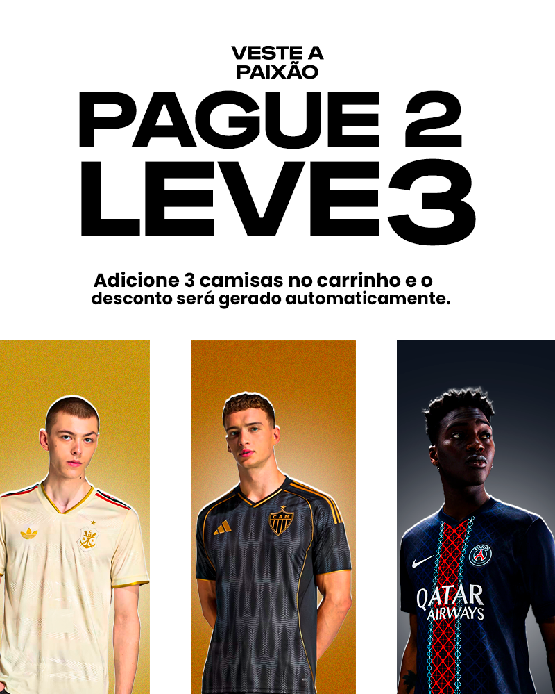 Aceitamos cartão de crédito (todas as bandeiras), Pix e boleto. No Pix, sua camisa já entra em processo de separação na hora. Mais rápido pra chegar até você!